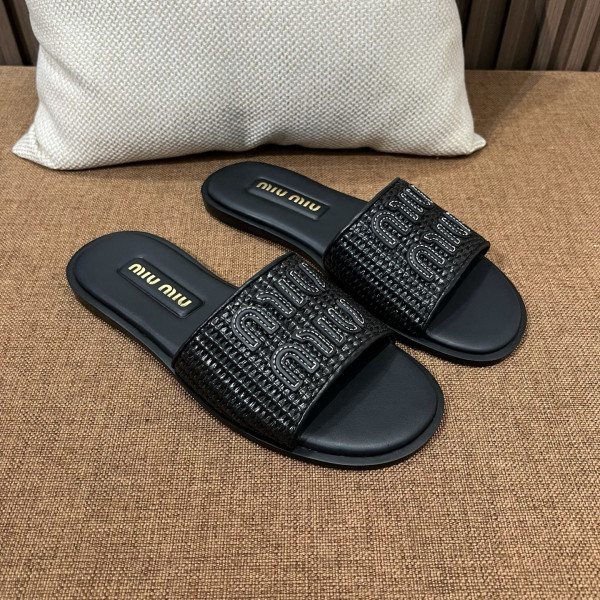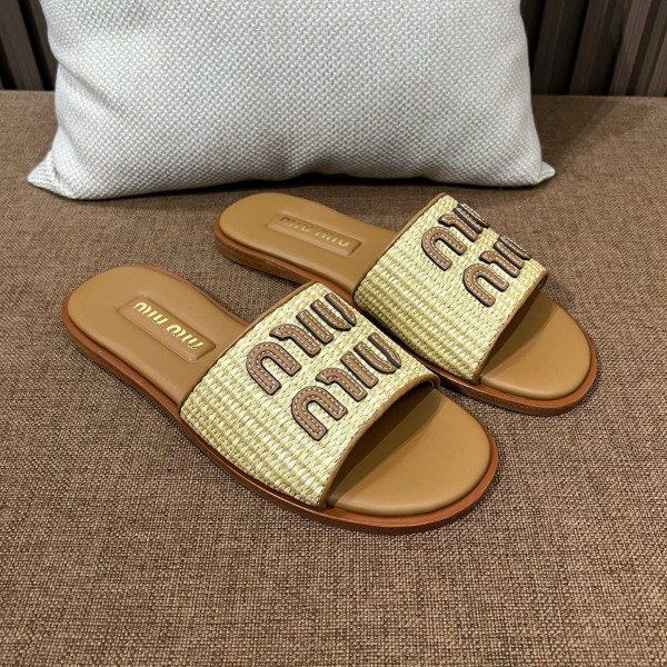 미우미우 라피아 짜임 레터링 슬리퍼