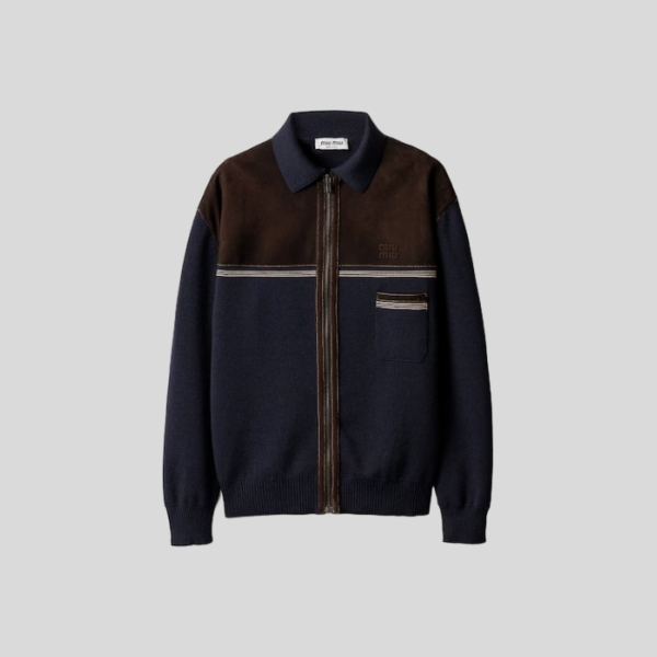 미우미우 울 및 가죽 지퍼 가디건